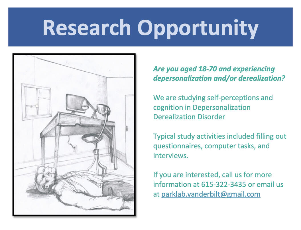 Participate in a Vanderbilt University Research Study!Title: Altered Self-Perceptions and Cognition in Depersonalization-Derealization Disorder and Psychosis-Spectrum DisordersDescription: We are exploring altered self-perceptions and cognition in depersonalization disorder. The online study (open to anyone in the US) includes a clinical interview; 11 self-assessments focused on depersonalization, trauma history, perceptions of self, social relations, and psychosis-proneness; and a semi-structured interview focused on experiences of depersonalization.If you are in the Nashville area, you may also participate in our in-person study visit, which could include additional cognitive testing, virtual reality, and an MRI scan, depending on your preference.Please fill out this brief study screening: https://redcap.vanderbilt.edu/surveys/?s=YMPPY8L9RMN7F84H or give us a call at 615-322-3435.